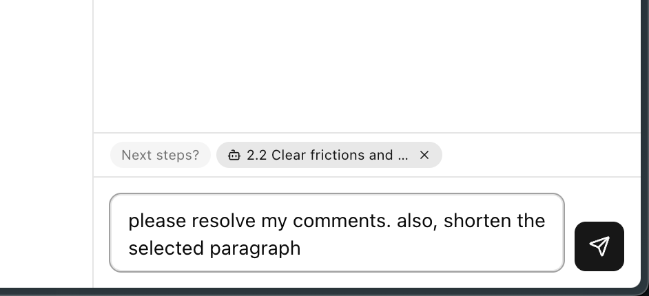 Select a section, reference a comment, and ask: "please resolve my comments. also, shorten the selected paragraph". The AI understands the context and applies precise edits — no copy-pasting needed.